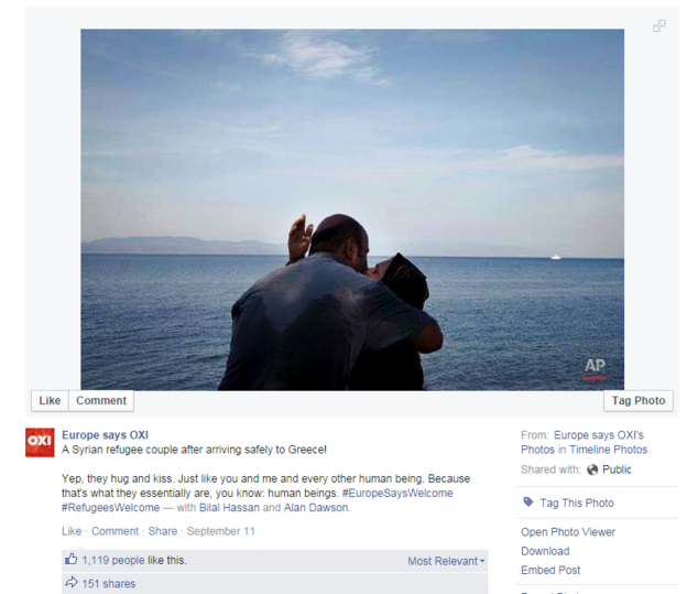 Uma foto da agência de notícias Associated Press mostrando um casal aos beijos após chegar à Grécia também movimentou o Facebook.
